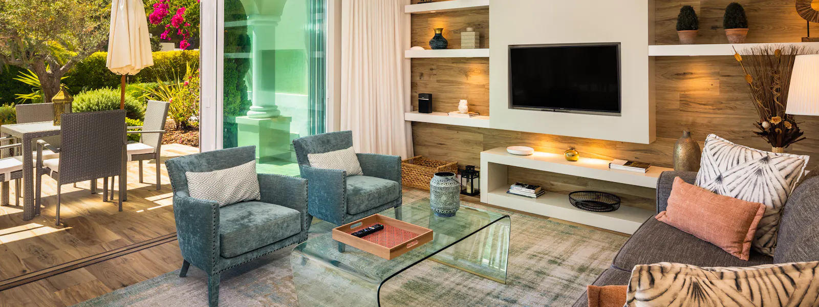 Our one-bedroom villas are stylishly decorated with modern furnishings and feature a living room with flat-screen cable TV, a fully equipped kitchen, and a furnished deck overlooking the gardens and pool. Perfect for couples or small families seeking a peaceful and cozy retreat.